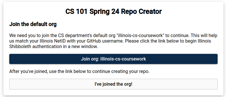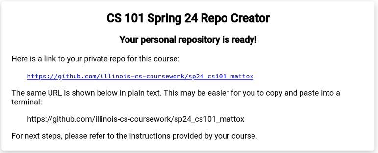 Access the magic repository creator link (note: as of this moment the link is not ready) to get started. You will see a web page with the following content. (The images below are for CS 110 Spring 2024, but when you follow the link it should say CS 421 Spring 2026. We don’t want to have to redownload the images each semester.)